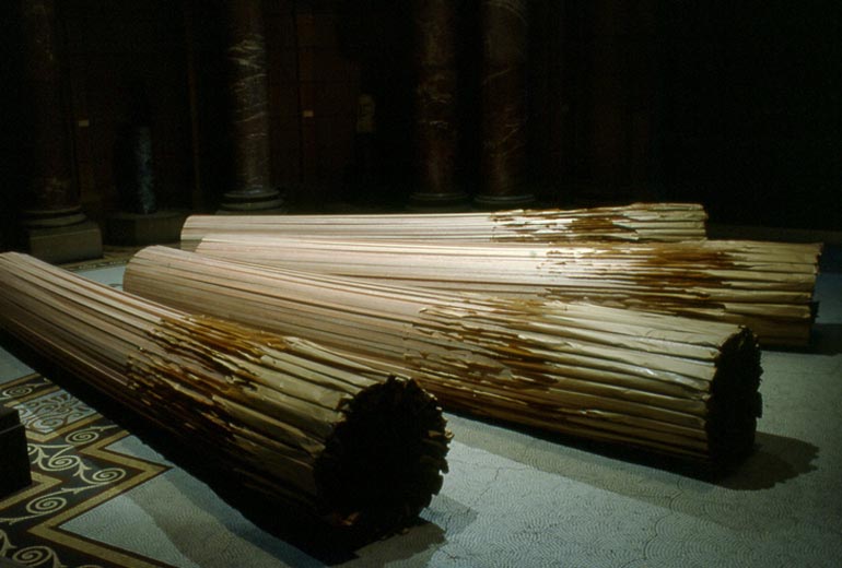 4 colonnes, Sydney, Art Gallery of new south wales, biennale, 1982. Liteaux bois, papier kraft.