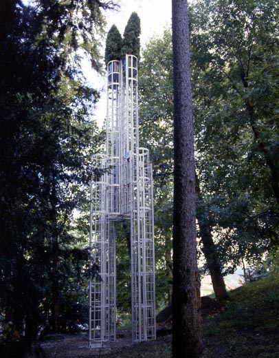 Sans titre, Bar-le-Duc, Jardin de l'Hôtel de Ville, 1987. Echelles à crinolines, 4 thuyas occidentalis.