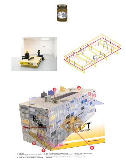 L'usine, Metz, Faux mouvement, 2003. Contre-plaqué, tubes PVC, toile PVC, ruches à bourdons.