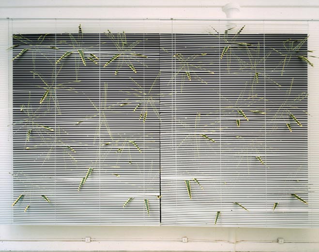 Agaves, Genève, Galerie Andata Ritorno, 1995. Rideau à lamelles, agaves artificiels, panneaux isolation noir.