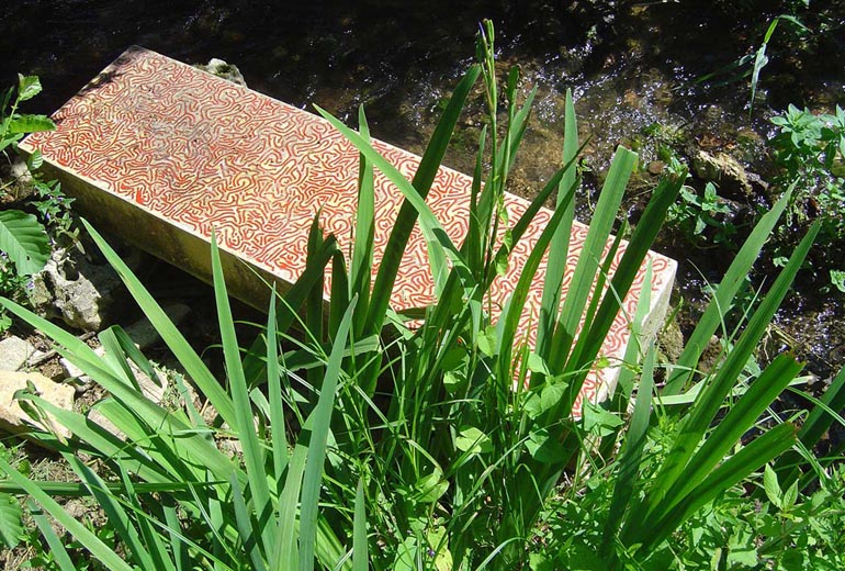 Bancs publics, Barbirey-sur-Ouche, parc du Château,1998. 5 bancs béton, motif vermiculé en résine incrustée.