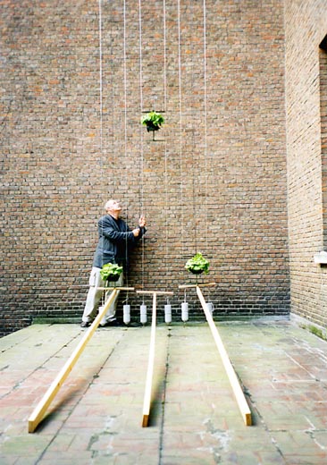 3 salades, Bruxelles, Sint-Lukas Hogesschool, 1998. Ascenceurs pour la chasse à la palombe, fil de fer, salades, contrepoids ciment.