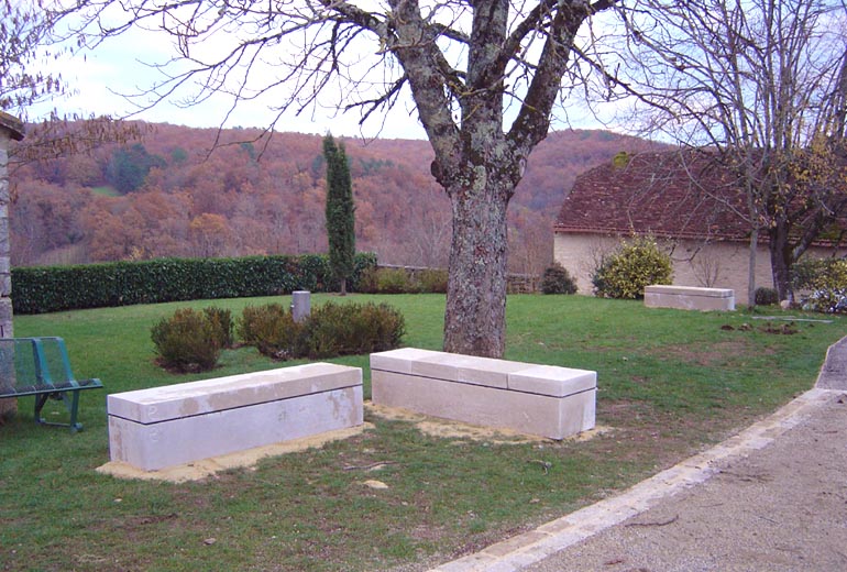 Bancs mous, Les Arques, centre du village, 2005. Commande publique. 9 bancs, pierre et caoutchouc, gravure.