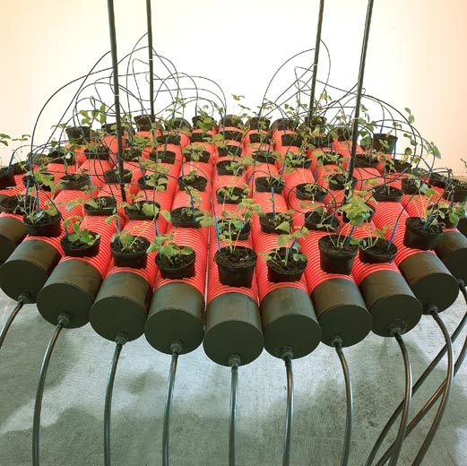 Vicomtesse Ericart de Thury, Calvignac, Salle paroissiale, 2002. Fraisiers vicomtesse Ericart de Thury, tubes T.P.C, goutte à goutte, lampe sodium.