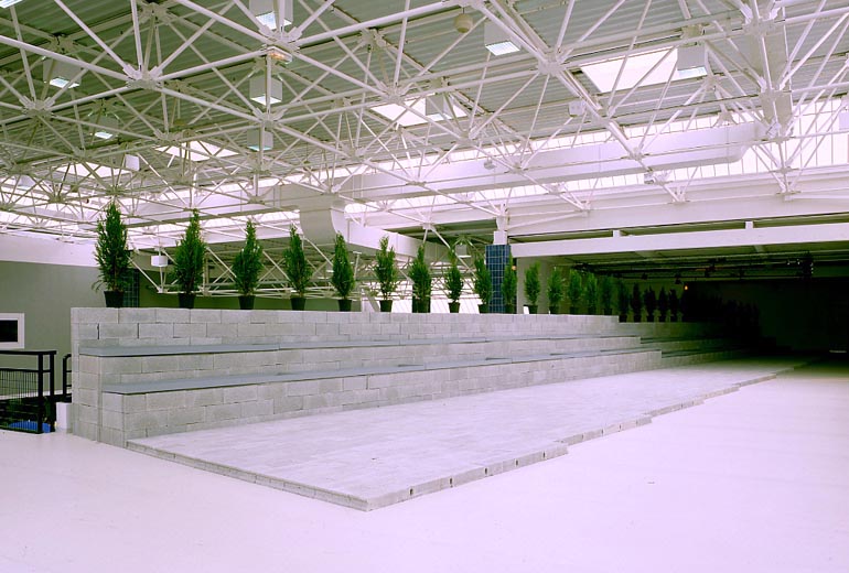 Sans titre, Pau, Parvis III, 1990. Moellons, bacs métalliques, eau, thuyas.