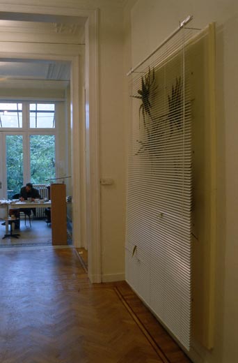 5 agaves 95, Anvers , Galerie Annie Gentils, 2000. Rideau à lamelles, agaves plastique, panneaux isolation jaune.