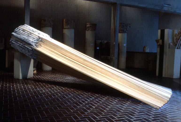Sans titre, Poitiers, Musée, symposium de sculpture, 1983. Liteaux pin, papier sérigraphié.