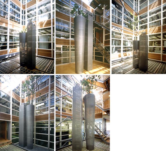 Sans titre, Haarlem, V.R.O.M place de la gare, 1998. Commande publique. Tôle inox perforée, vigne, figuier, citronnier, cognassier, cerisier, brumisation, arrosage.