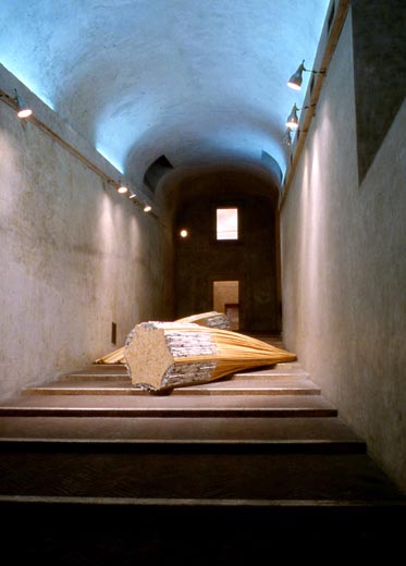 2 colonnes, Rome, Villa Médicis, Nell'arte, 1983. Liteaux pin, papier sérigraphié.
