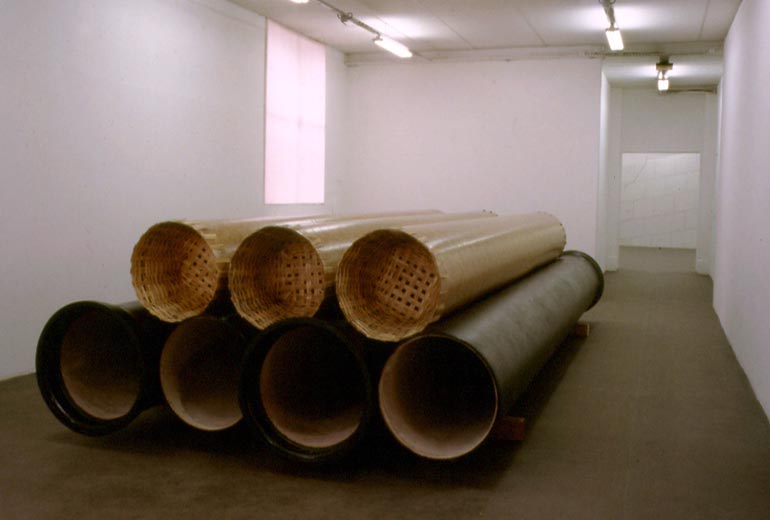 Colonnes 86, Villeurbanne, Nouveau Musée, 1989. Tuyeaux fonte, linoléum, corbeilles bambou.