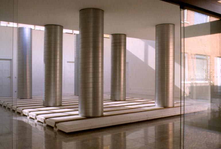 Construction, Waregem, Usine SOBINCO, 1989. Hourdis polystyréne, poutrelles béton, tubes métal.