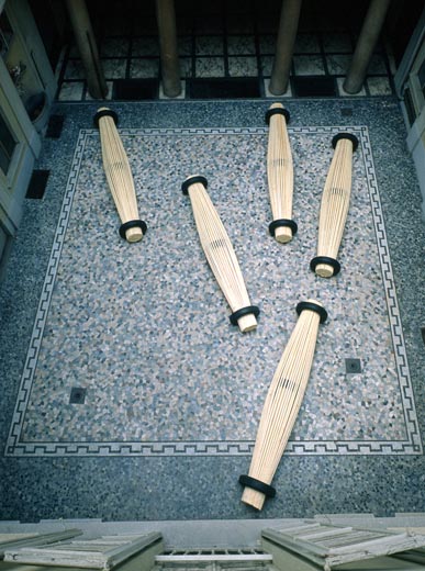 6 colonnes, Milan, Galerie Deambrogi, 1984. Liteaux de sapin, pneus.