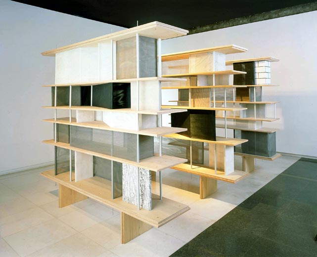 3 cases, Paris, Galerie Site Odeon, 2001. Contre-plaqué, tubes PVC, tiges filetées, toile PVC.