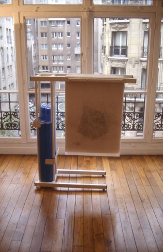 Chantier mobile, Paris, Magalerie Perrotin, 1992. Chantier mobile, tubes plastique bleu, photocopies dessins sur calque polyester.